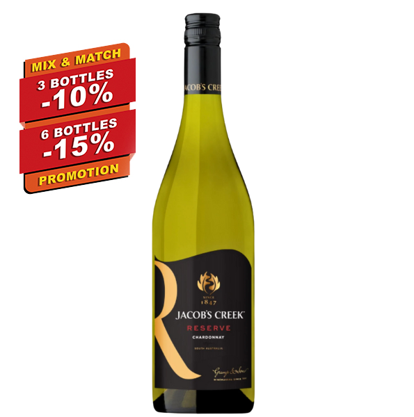 *A – JACOB’S CREEK RESERVE CHARDONNAY – 750MLJacob’s Creek Reserve Chardonnay has attractive melon and fresh fruit flavours complemented by subtle toasty oak are hallmarks of this fresh crisp wine.